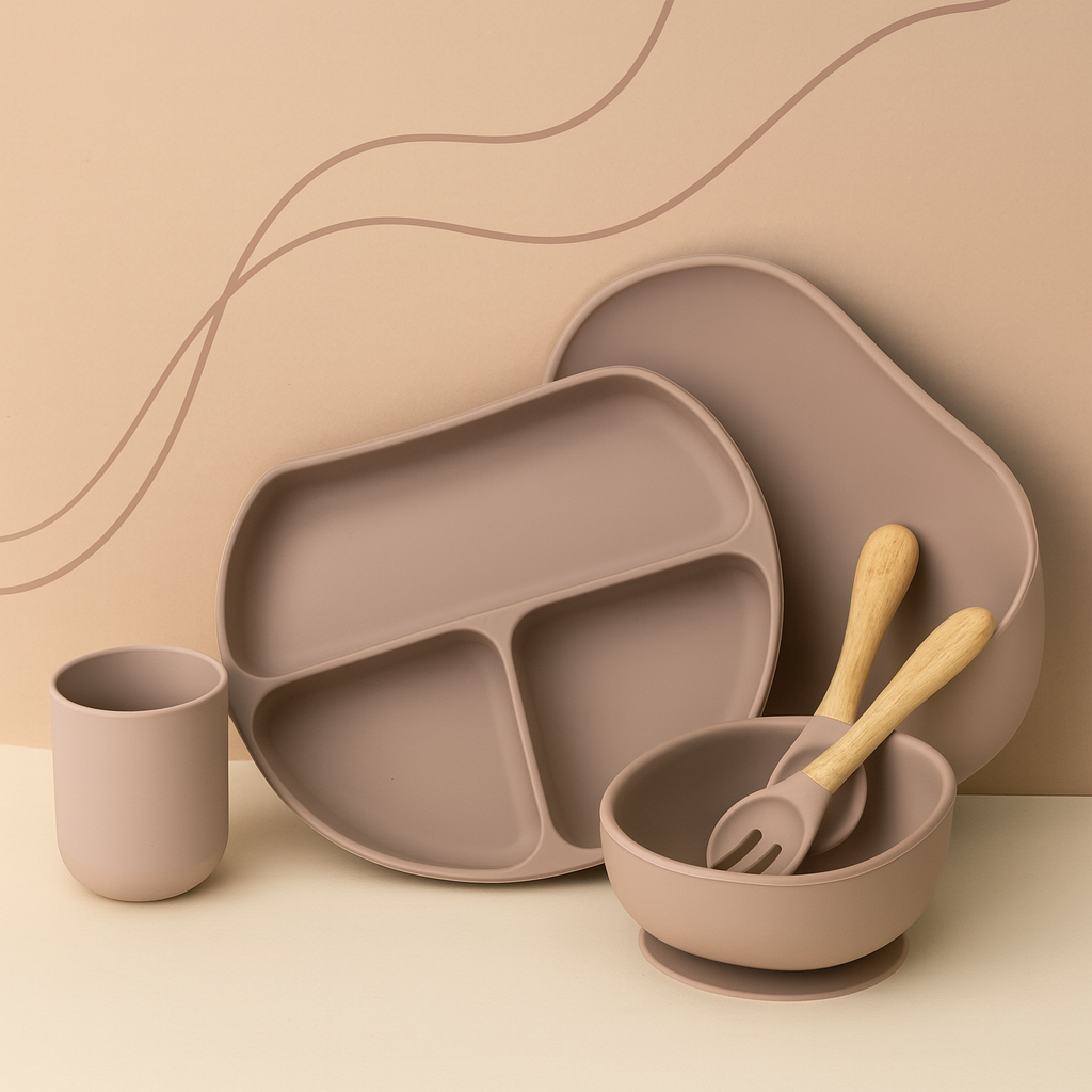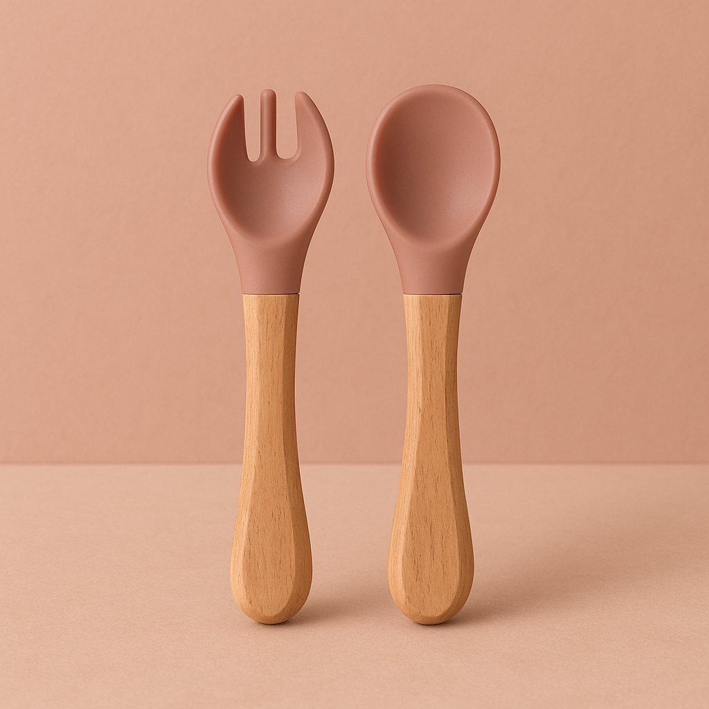 - Ske og gaffel: Bløde og fleksible med afrundede kanter for at beskytte små munde og gummer.